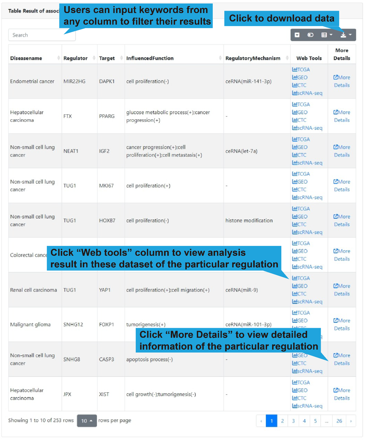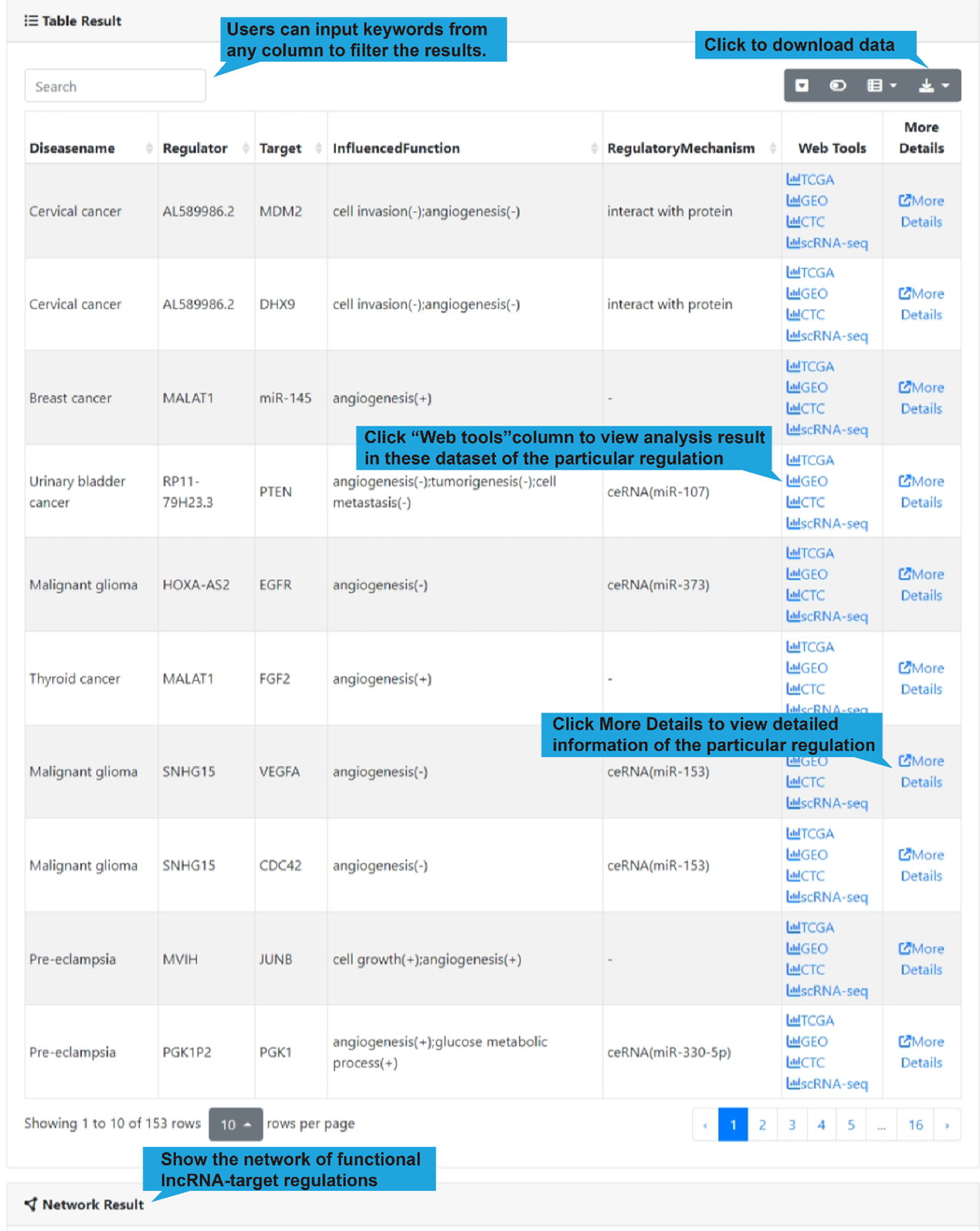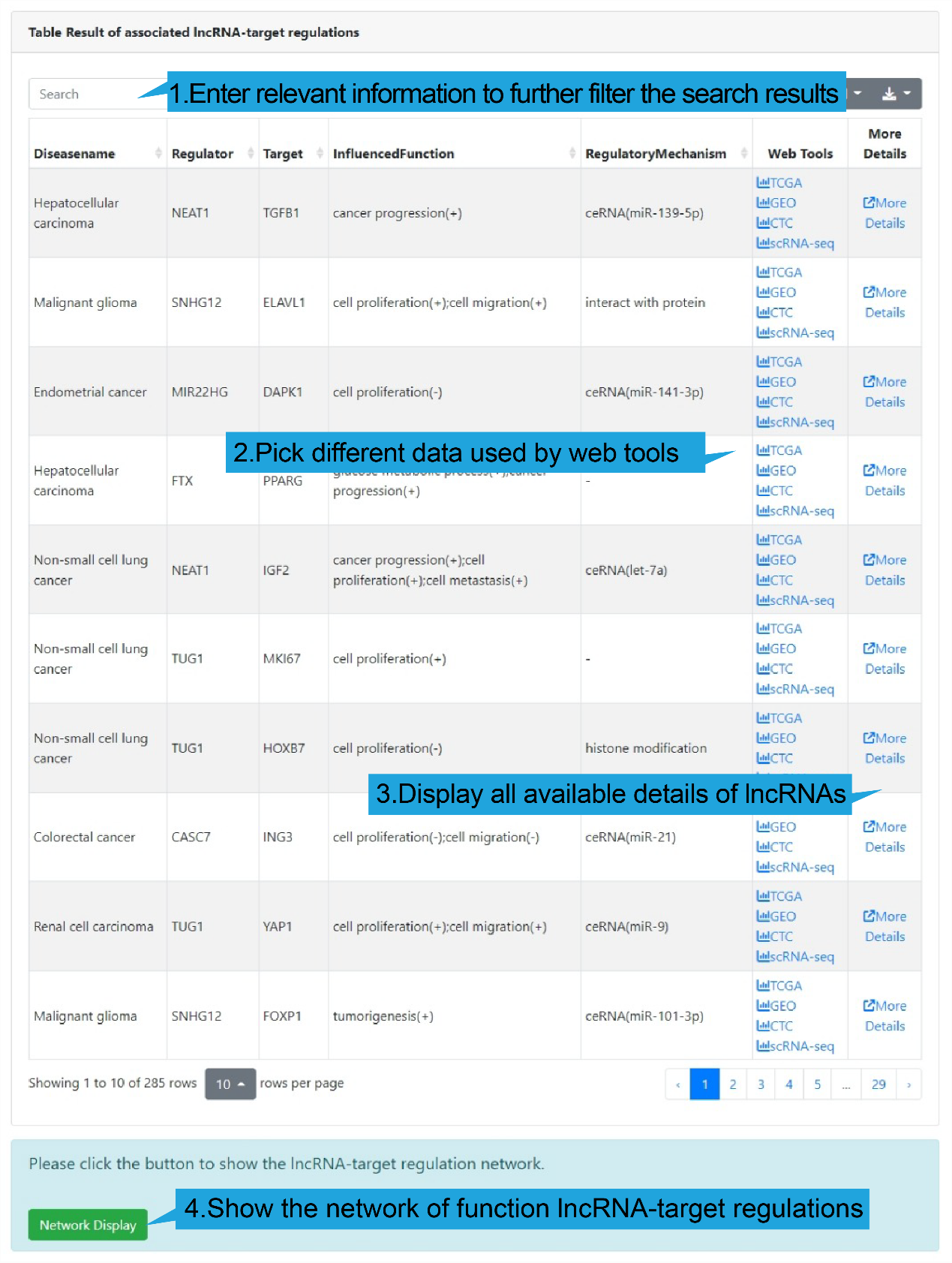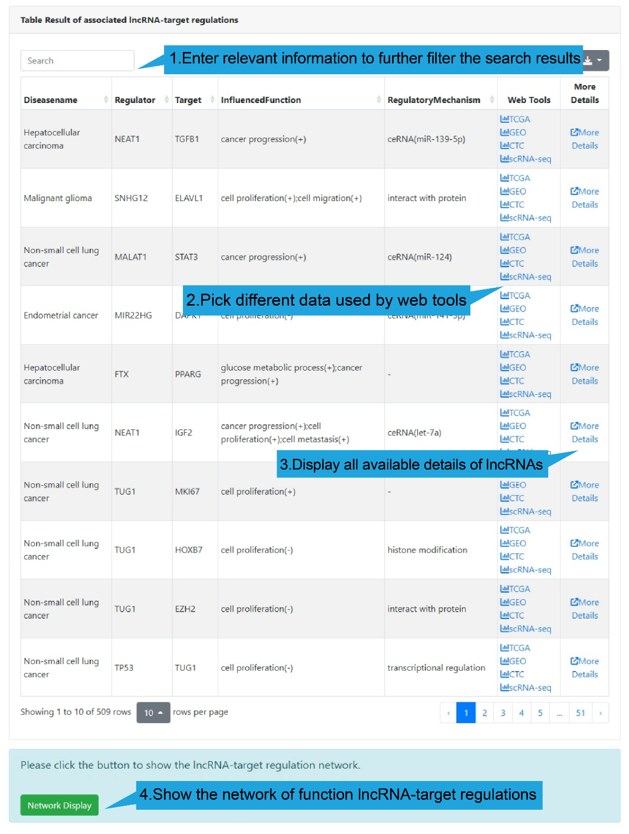 lncRNA-target regulation will be displayed on a new page. The results of the Web Tools