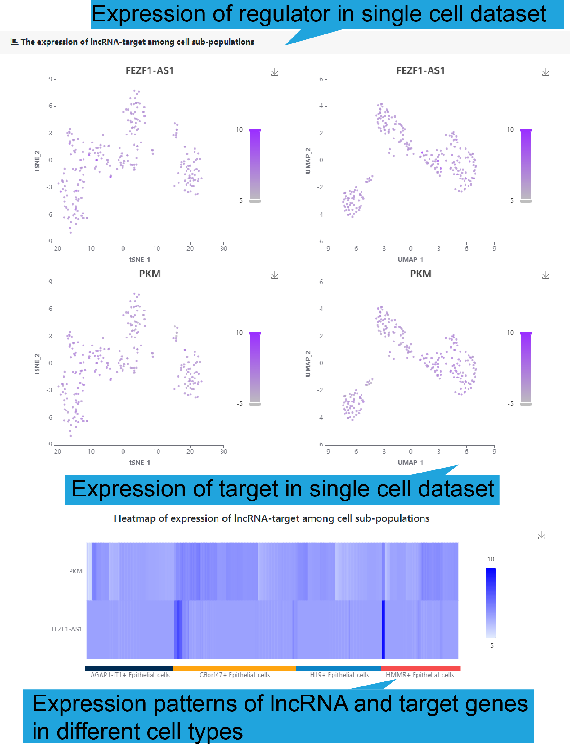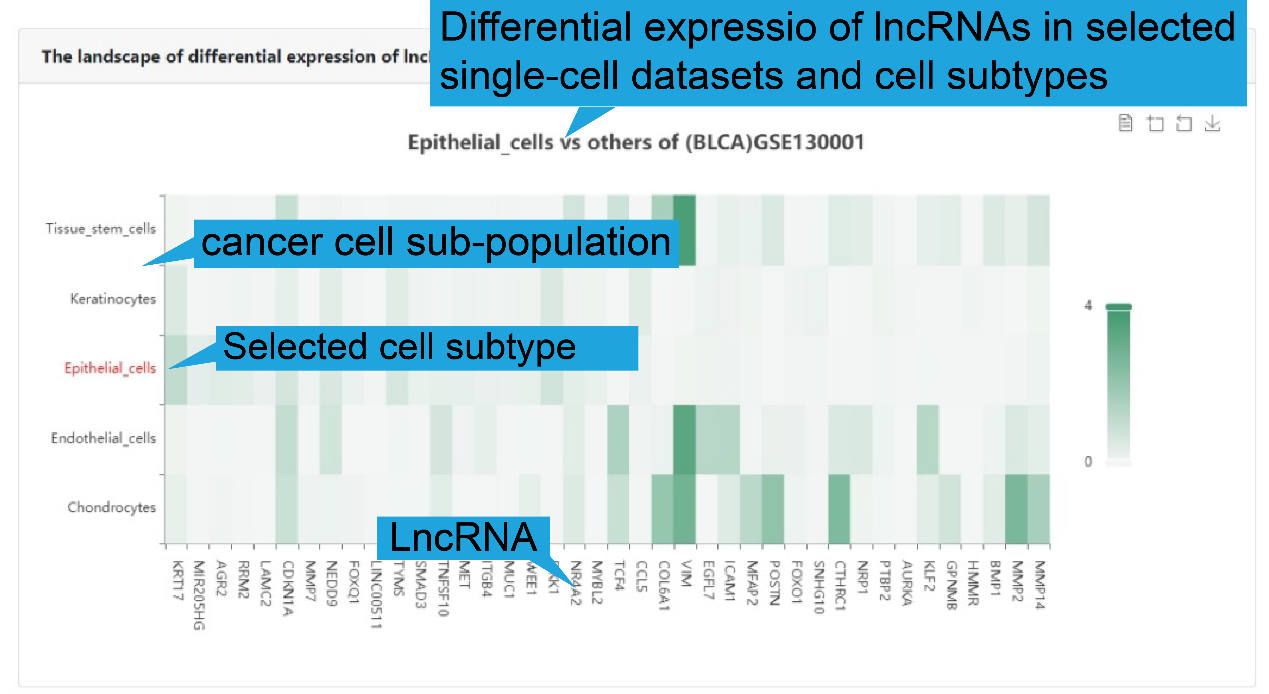 sub-populations is displayed. Users can select a lncRNA, a cancer single-cell datasets