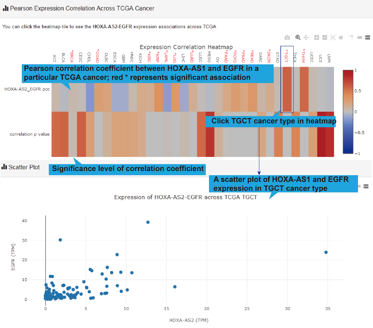 coefficient and a scatter plot of lncRNA-target expression in TCGA pan-cancers, GEO
