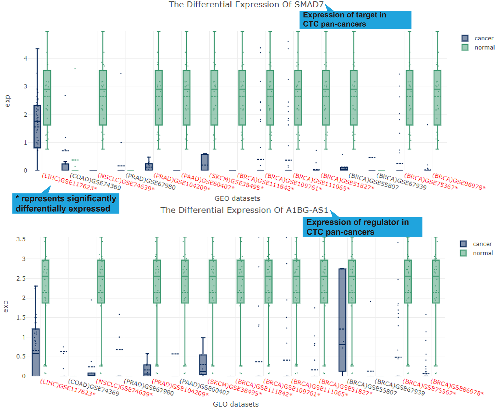 lncRNA-target regulation in TCGA, GEO (if available), CTC and Single Cell datasets. For